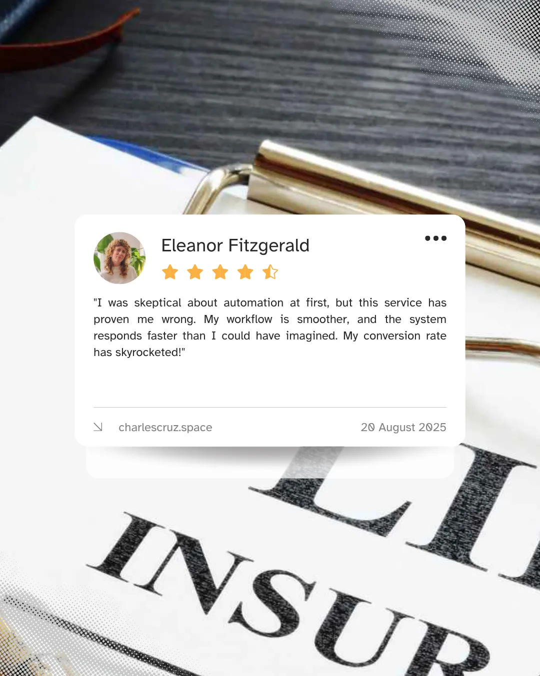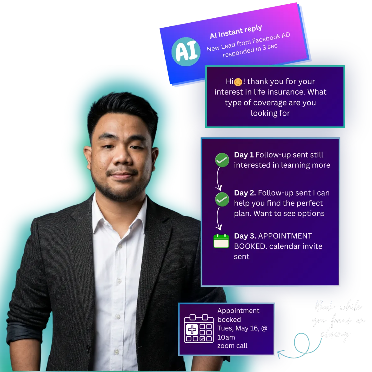Take control of your leads, follow-ups, and appointments with our AI-powered automation. Stop wasting time and start focusing on what truly matters—closing more policies!